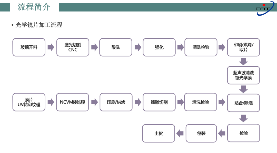 加工方面的核心就是精密度。一个镜片有时要贴好几张膜,每张膜的颜色不一样,纹理也不同,还有印刷字符等,所以一个镜片,原料那么大的玻璃,要经过开料、激光切割、酸洗、印刷、镀膜、贴合等二十几道工序,每一道工序都有精密度的考量,大概历时一周才能完成。